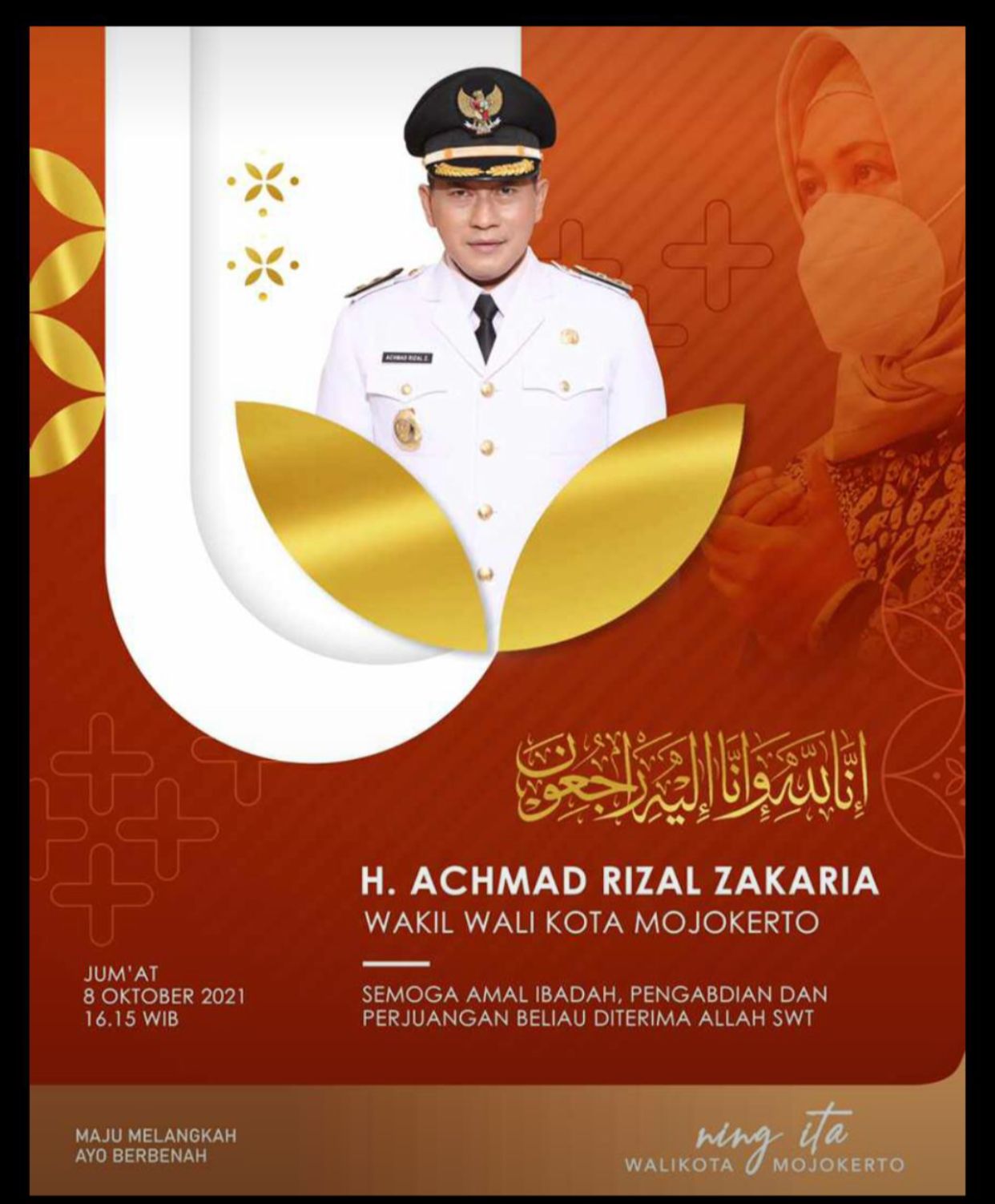 Kabar duka datang dari Pemkot Mojokerto,Wakil Walikota Mojokerto Achmad Rizal Zakaria meninggal dunia pada hari ini jumat 08-10-2021 sekitar pukul 16.15 WIB,di rumah sakit Dr Soewandhi Surabaya.