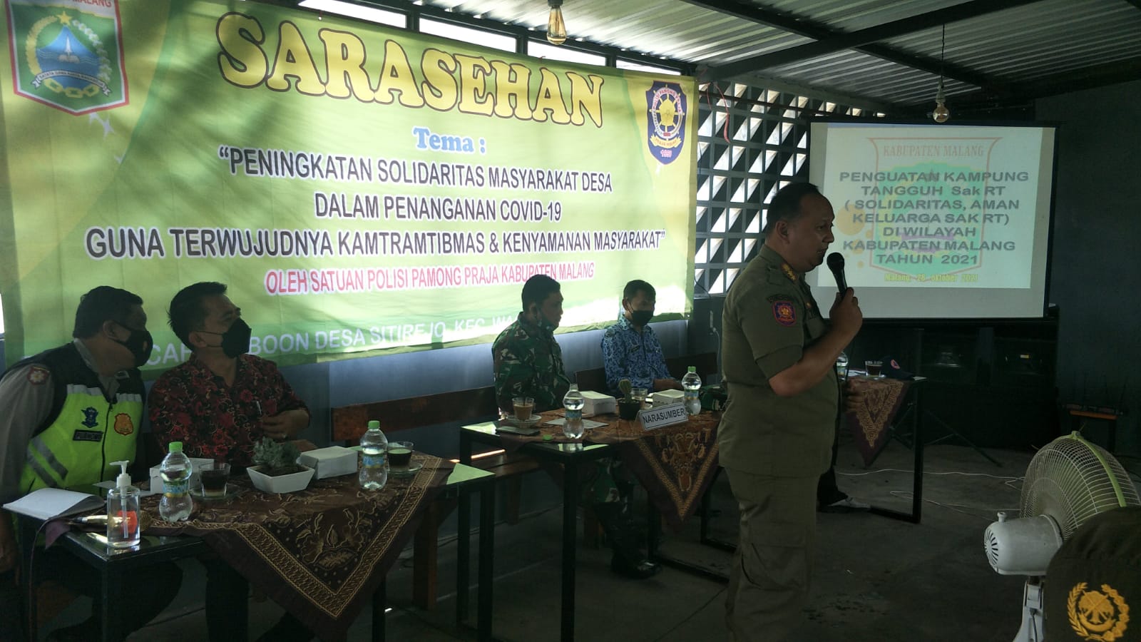 Satuan Polisi Pamong Praja (Satpol PP) Kabupaten Malang Kamis (28/10/2021) bertempat di Kebun Kopi Desa Sitirejo, Kecamatan Wangir Kabupaten Malang menggelar Sarasahan dengan tema Peningkatan Solidaritas Masyarakat Desa dalam penanganan covid-19, guna terwujudnya Kamtramtibmas dan kenyamanan masyarakat.