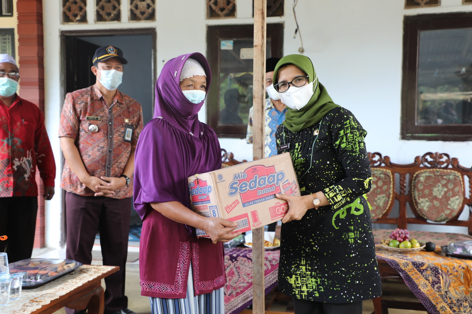 Rini Syarifah Bupati Blitar didampingi Plt Dinas Sosial dan Ketua Dekranasda menyalurkan bantuan kepada warta Telaga Gentong di Desa Sumberurip, Kecamatan Doko, jumat (31/12/21) lalu.