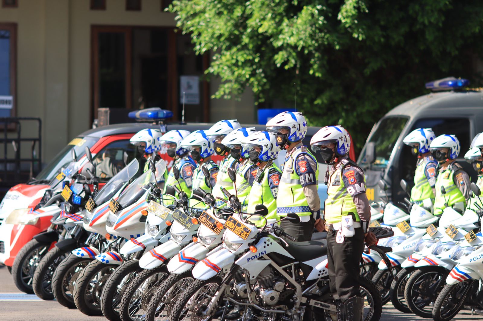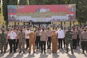 Polres Kediri menggelar Apel Gelar Pasukan PAMOR KERIS (Patroli Motor Penegak Protokol Kesehatan di Masyarakat) di halaman belakang Mapolres Kediri, Senin (24/01/2022).