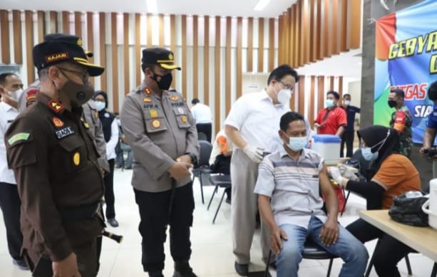 Kapolres Mojokerto AKBP Apip Ginanjar secara langsung meninjau pelaksanaan vaksinasi tersebut sembari memberikan himbauan terkait protokol kesehatan kepada para peserta vaksin.