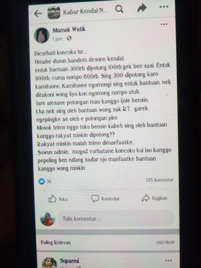 Akun dengan nama Mamak Watik yang muncul di Kabar Kendal saat itu menuliskan mendapat curhatan temannya yang berada di Dusun Bandem menyebutkan bantuan tunai 300 ribu per-bulan untuk warga dipotong 100ribu. Potongan tersebut dimintai dengan dalih untuk ganti uang bensin. Namun tidak menyebutkan dengan jelas jenis bantuan apa yang diduga telah dipotong oleh oknum Kasun yang disebutkan. Hanya saja didalam postingan akun tersebut jelas terlihat adanya kata-kata yang menuturkan bahwa penerima bantuan telah diwanti wanti agar mengatakan terima utuh bila ada orang lain yang bertanya tentang penerimaannya.