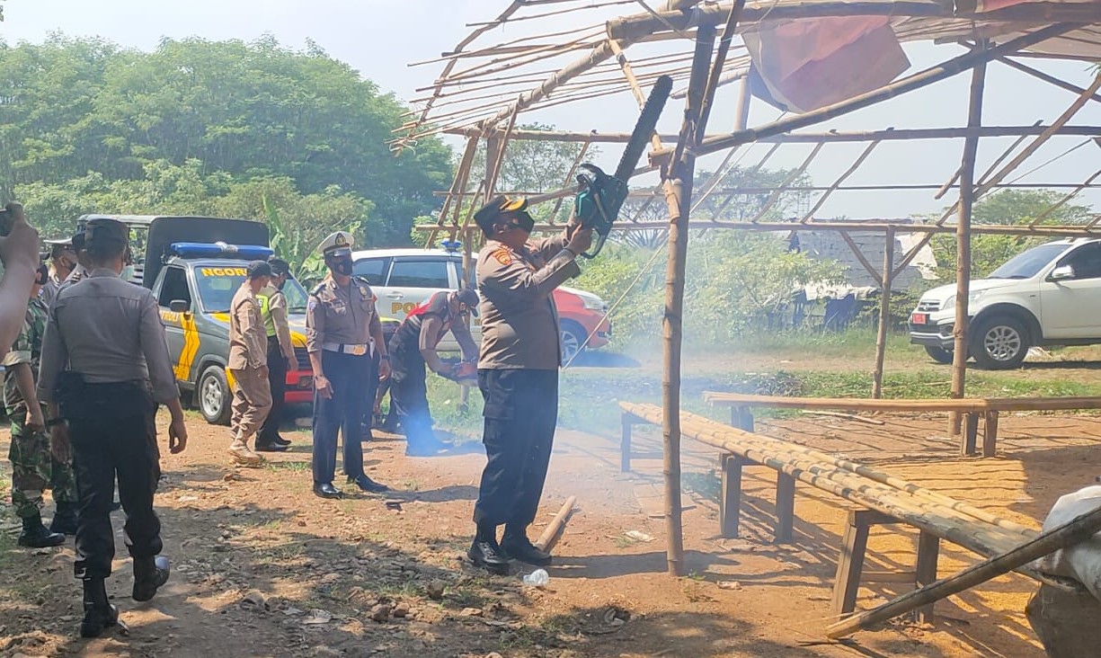 Jajaran Polres Mojokerto bersama Forkopimcam Kecamatan Ngoro, membongkar tempat judi sabung ayam di Dusun Jurangsari, Desa Lolawang Kecamatan Ngoro Kabupaten Mojokerto, Jumat (15/7).