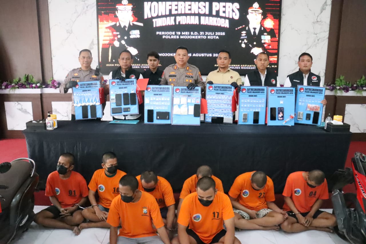 Dari total 25 tersangka, Polres Mojokerto Kota menghadirkan 8 tersangka, sementara 17 lainnya telah dilimpahkan ke Lapas Kelas II B Mojokerto. Seluruh tersangka diamankan saat beraksi di wilayah hukum Polres Mojokerto Kota yang berdasarkan 22 Laporan Polisi.